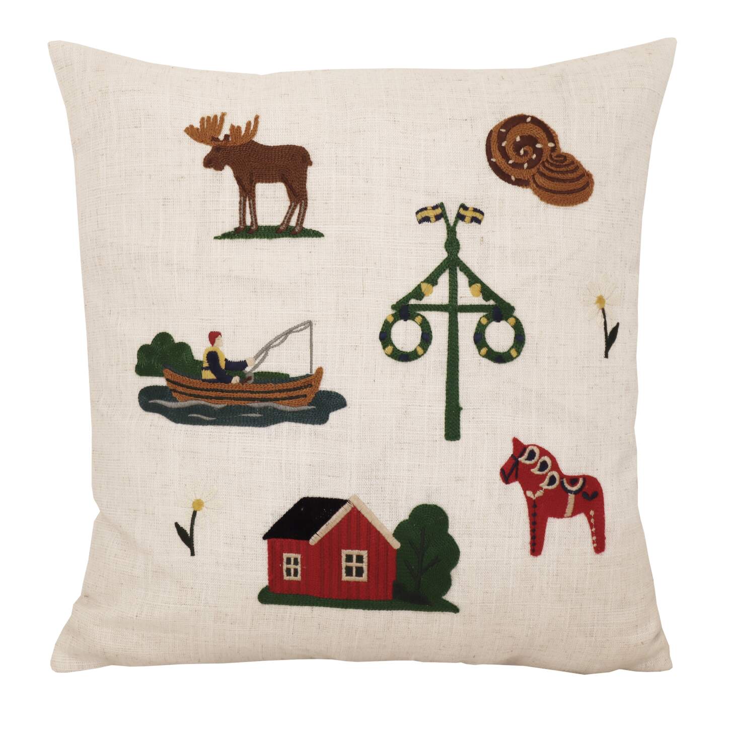 Stl. 45x45 cm, kuddfodral med broderade motiv Allt från ett klassisk rött torp, midsommarstång, dalahäst, prästkragar, fika och skogens konung! Enfärgad baksida och dold dragkedja nertill.