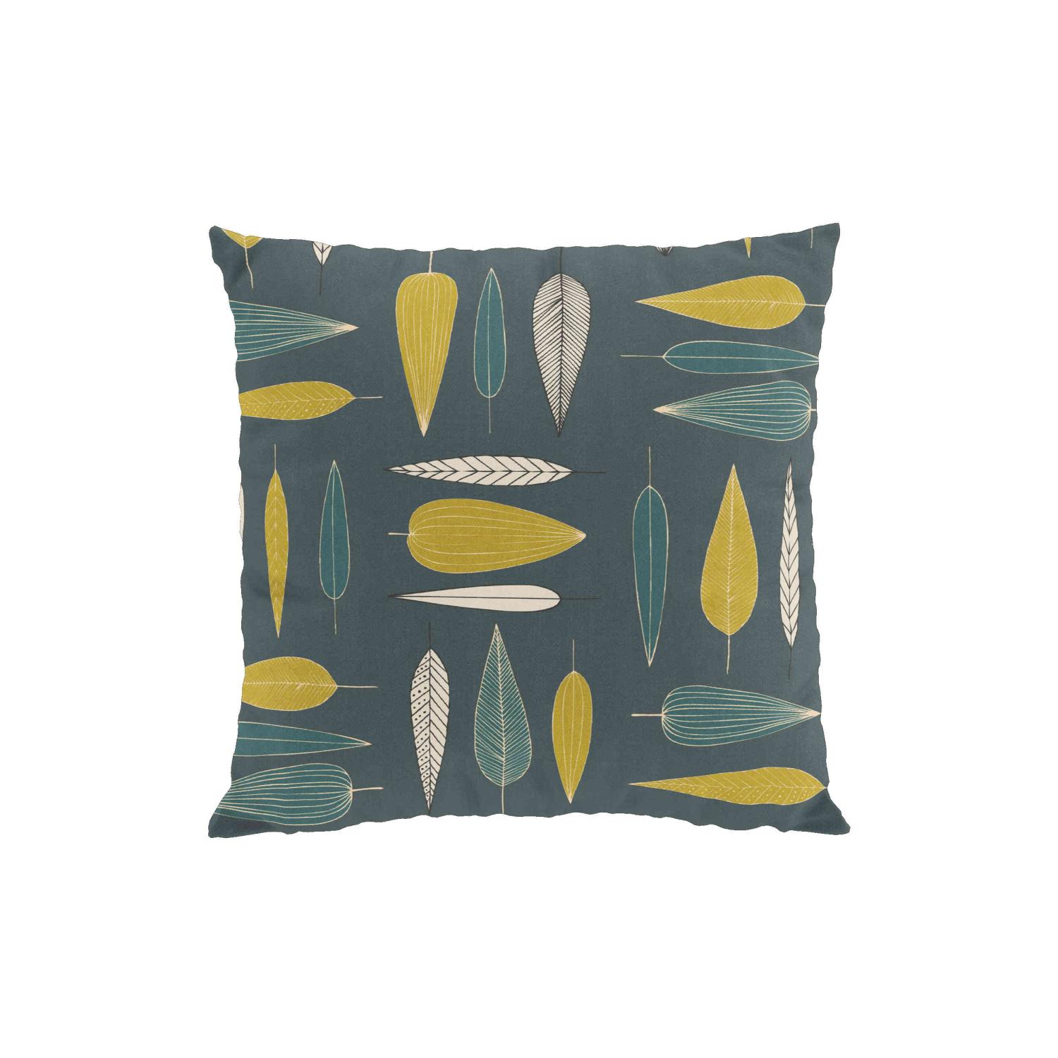 Kuddfodral UNDER TRÄDET med gulgröna, grå och turkos blad på mörk turkos bottenfärg
