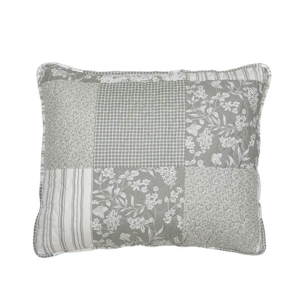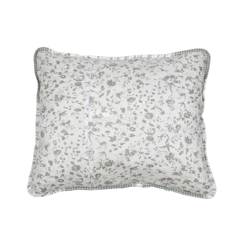 Stl. 50X60cm. Kuddfodral VERDI i charmig lapptäcketeknik i milda gröna nyanser. Baksidan är i ett småblommigt mönster på en offwhitefärgad botten.
