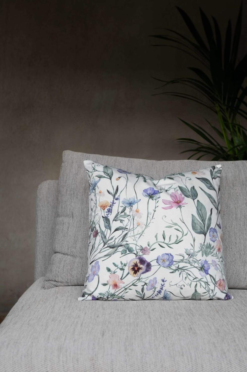 Kuddfodral VIOLA med violer och slingrande blad på offwhite bottenfärg
