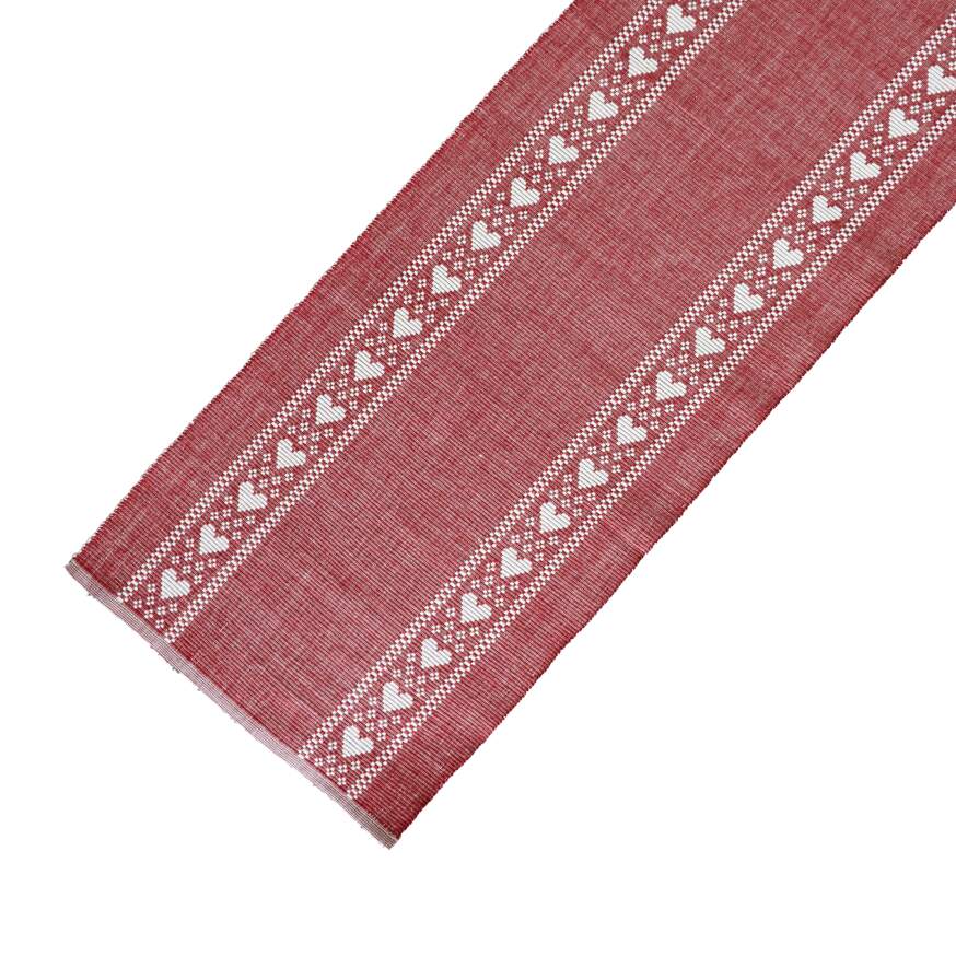 Löpare KAJSA, röd jaquardvävd duk med vita hjärtan utmed långsidorna