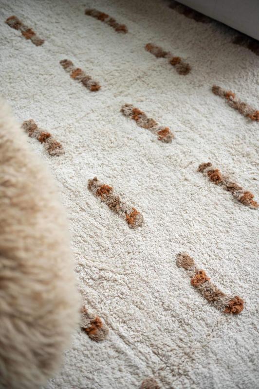 Matta TINE, tuftad i offwhite med bruna inslag, flätad frans i kortsidorna