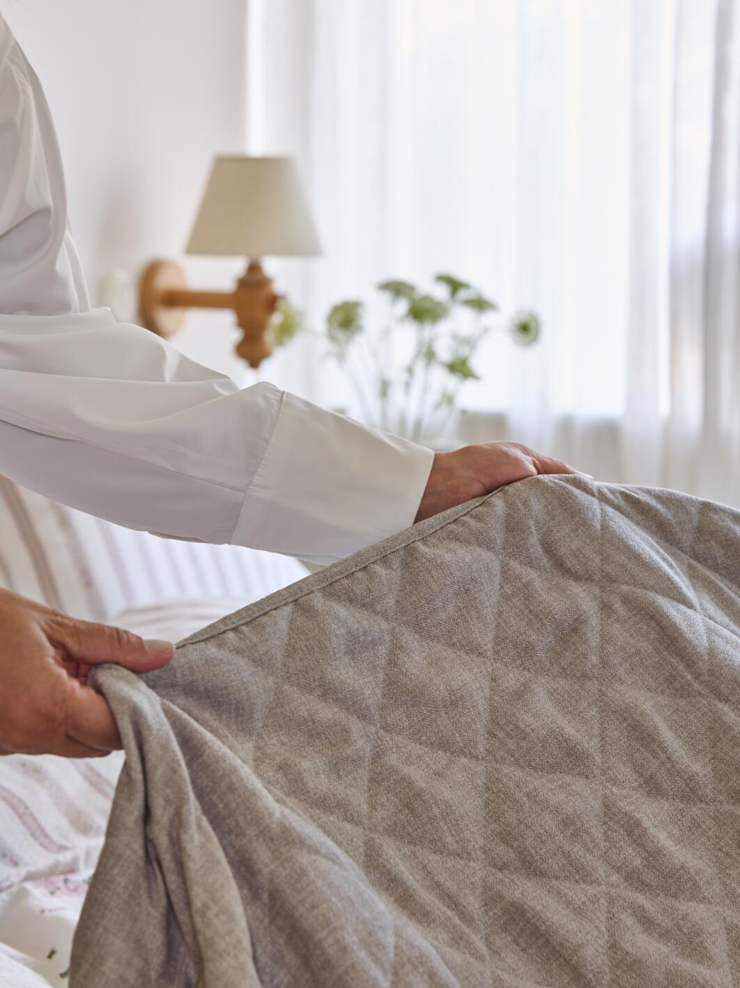 Stl. 160x260 cm, Överkast SKYMNING enfärgat, melerat och quiltat i rutmönster. Baksida i microfiber. Finns även som mörkläggningsgardin.