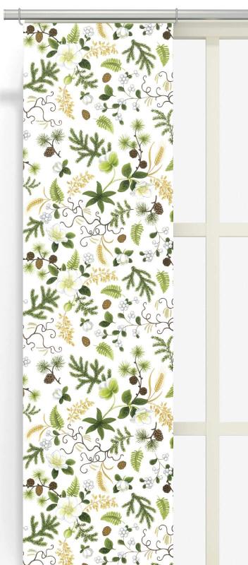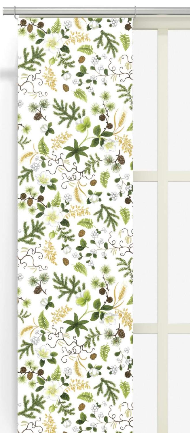 Bilden visar endast exempel på hur panelgardinen kan se ut. Mönstret är större än panelens bredd och placeringen av mönstret varierar. Varje panel är därför unik.