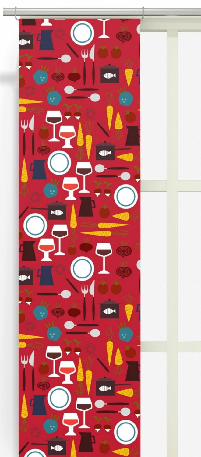 Panelgardin DINNER med köksredskap och grönsaker i vinrött, orange, vitt och turkos på röd botten