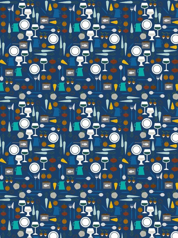 Panelgardin DINNER med köksredskap och grönsaker i vitt, blått, brunt och turkos på blå botten