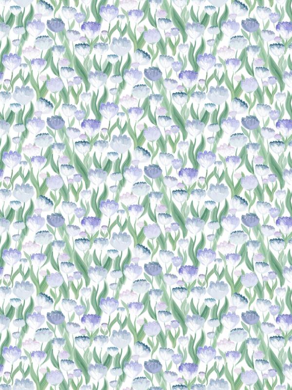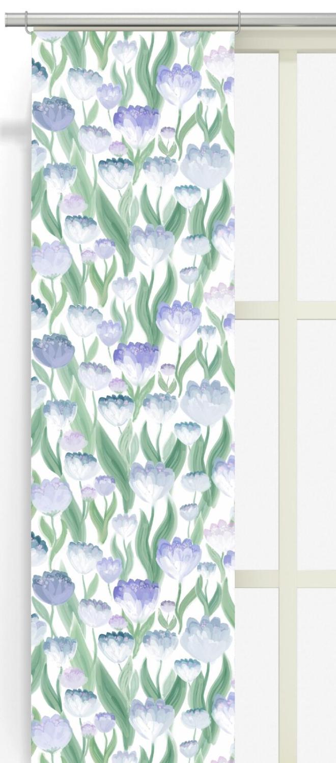 Panelgardin LJUVLIGT med blå tulpaner på offwhite bottenfärg
