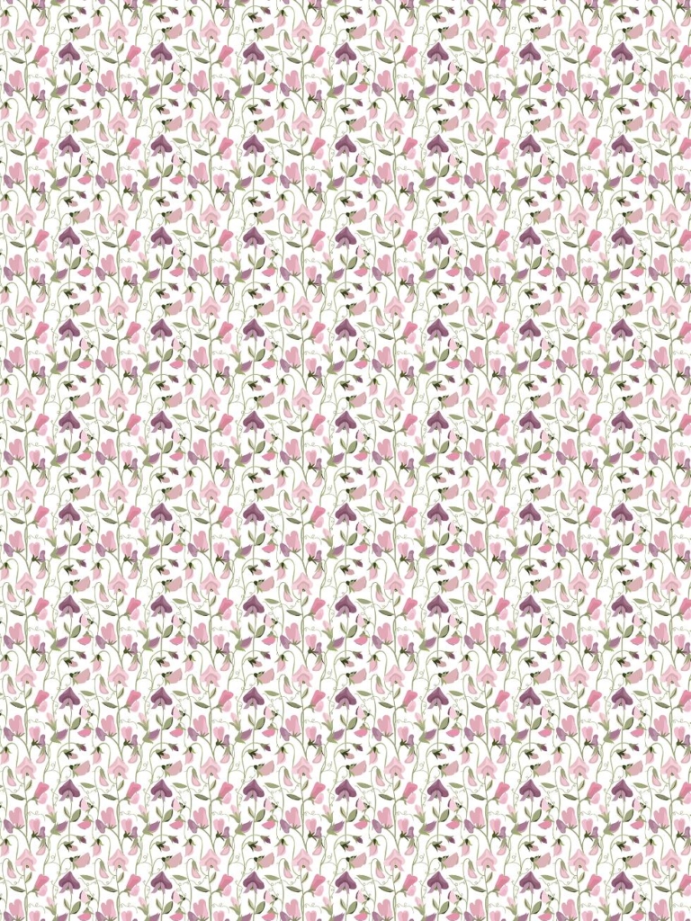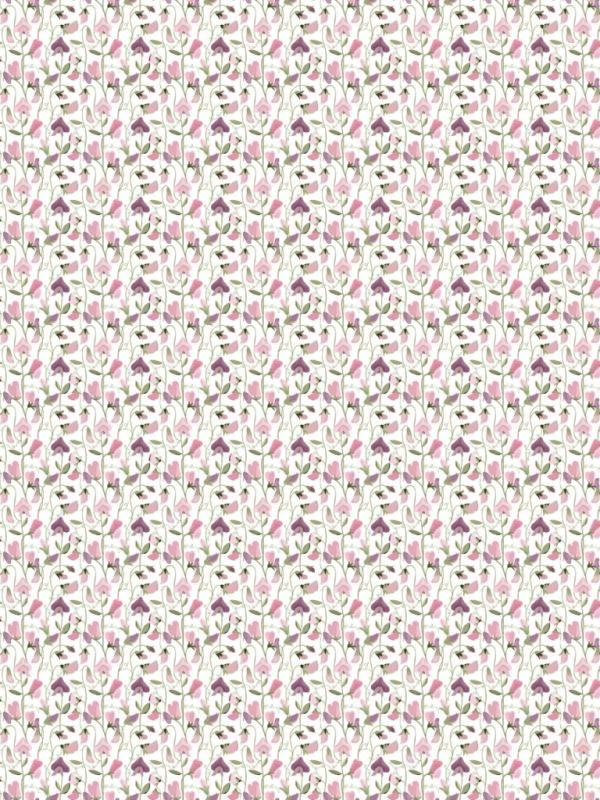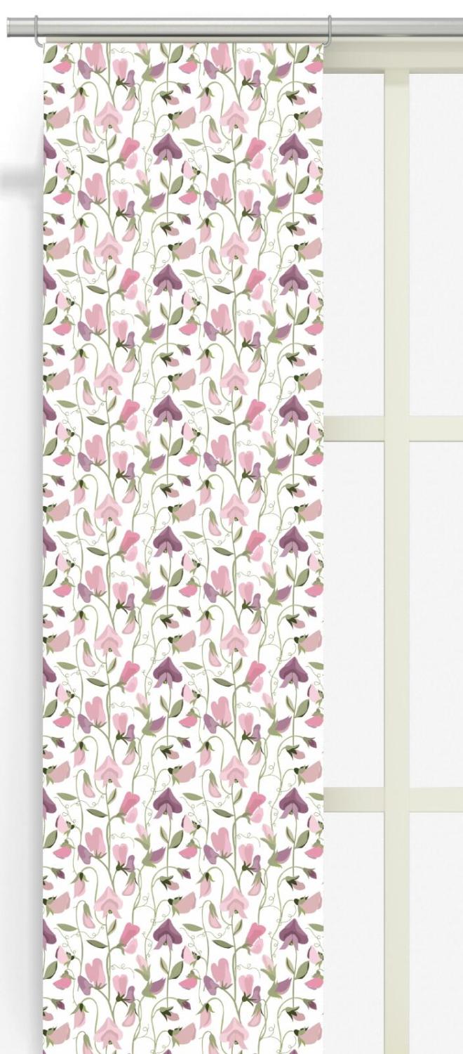 Panelgardin LUKTÄRT med luktärtor i ljusrosa och lila på offwhite bottenfärg