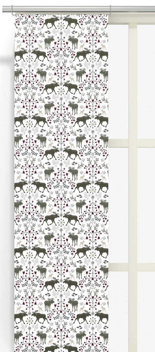 Panelgardin SKOGENS KONUNG med älgar i khakigrönt på vit botten