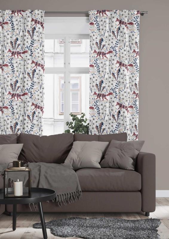 Panelgardin Stjärnspeja med fantasifulla rävar och växter i beige och rött