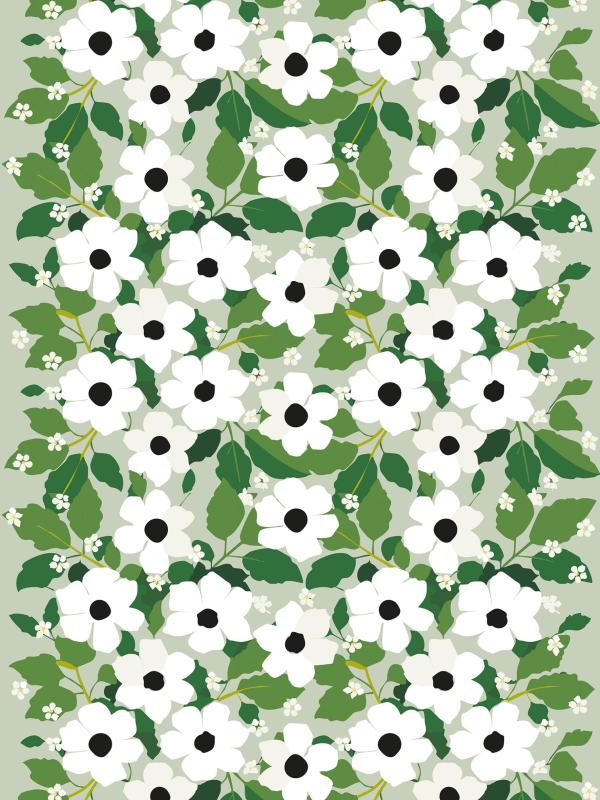 Panelgardin SVARTÖGA med blomman svartöga i vitt och gröna blad