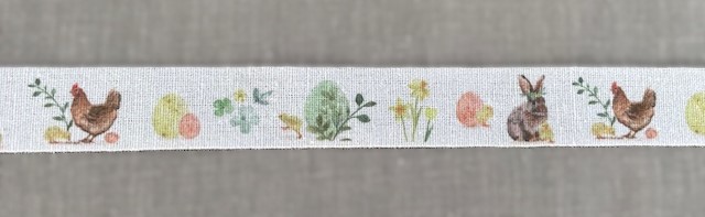 Påskband med tryckta hönor, harar, ägg och påskliljor