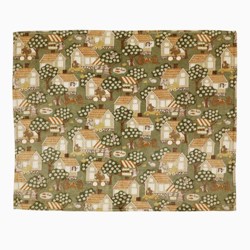 Pläd ÅSGRÄND med hundar och katter i lek bland små hus, grön bottenfärg