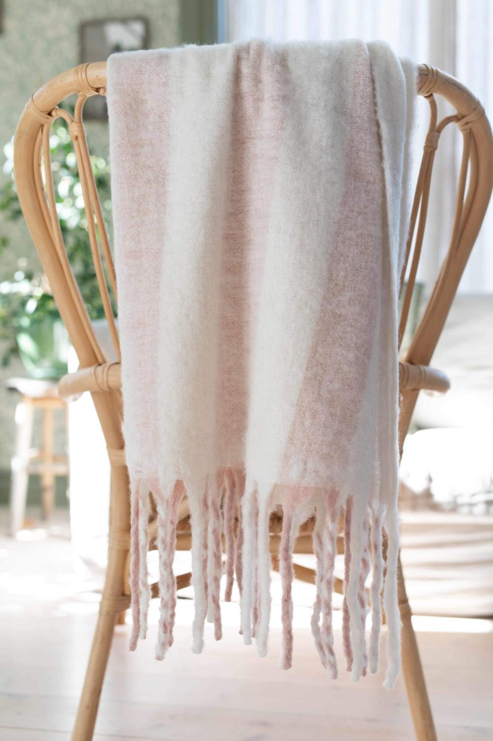 Pläd MIA bredrandig i offwhite och rosa med långa fransar