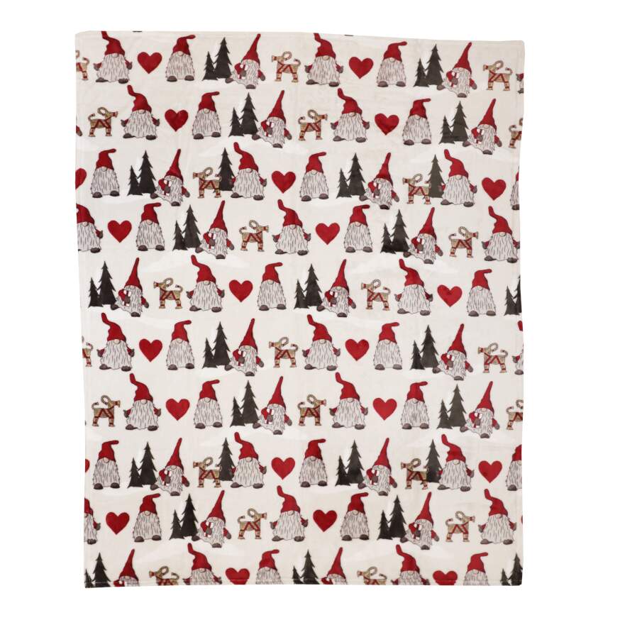 Pläd NOEL med tomtar, granar, hjärtan och halmjulbockar på ljust linnefärgad botten