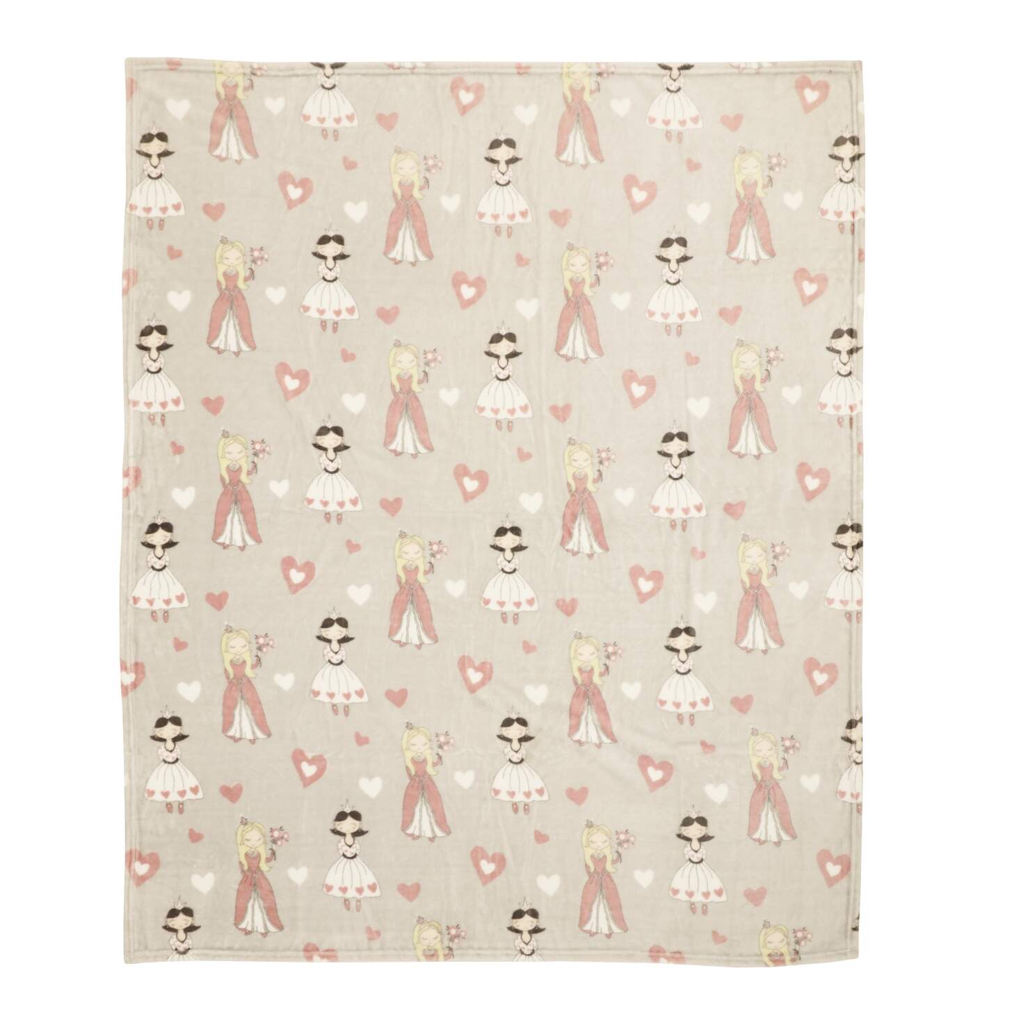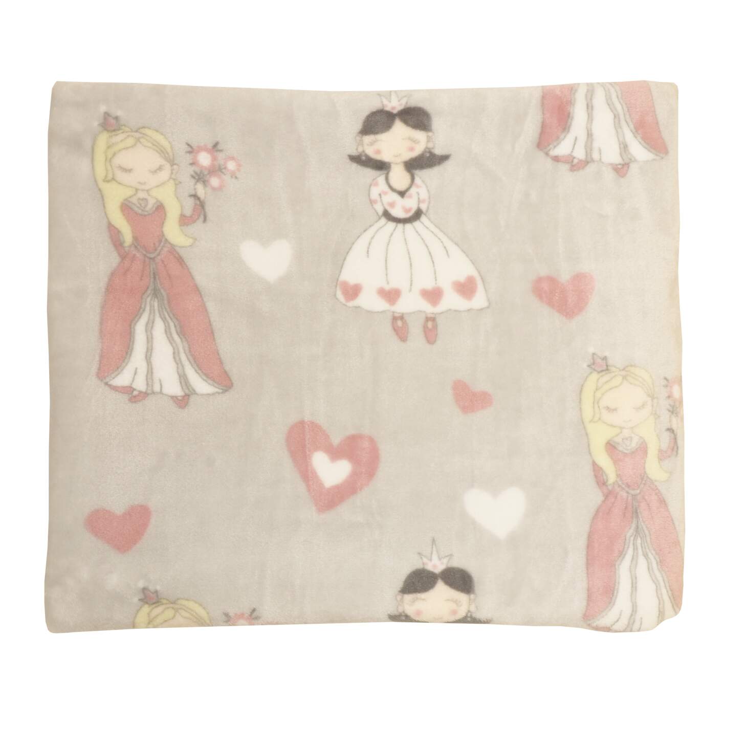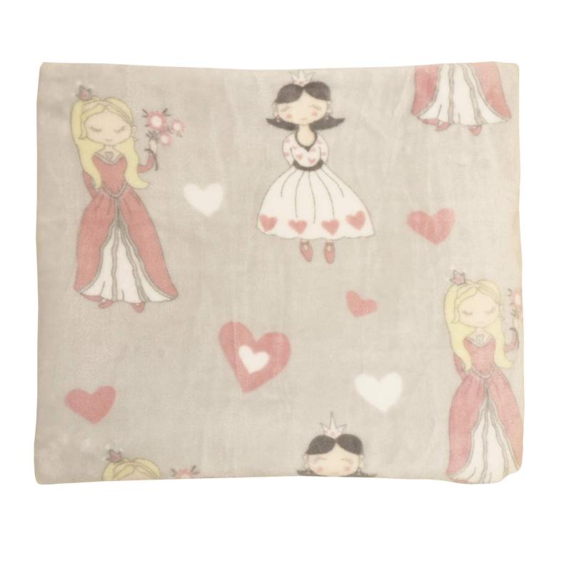 Pläd PRINSESSA i fleece med prinsessor och hjärtan i rosa på grå bottenfärg