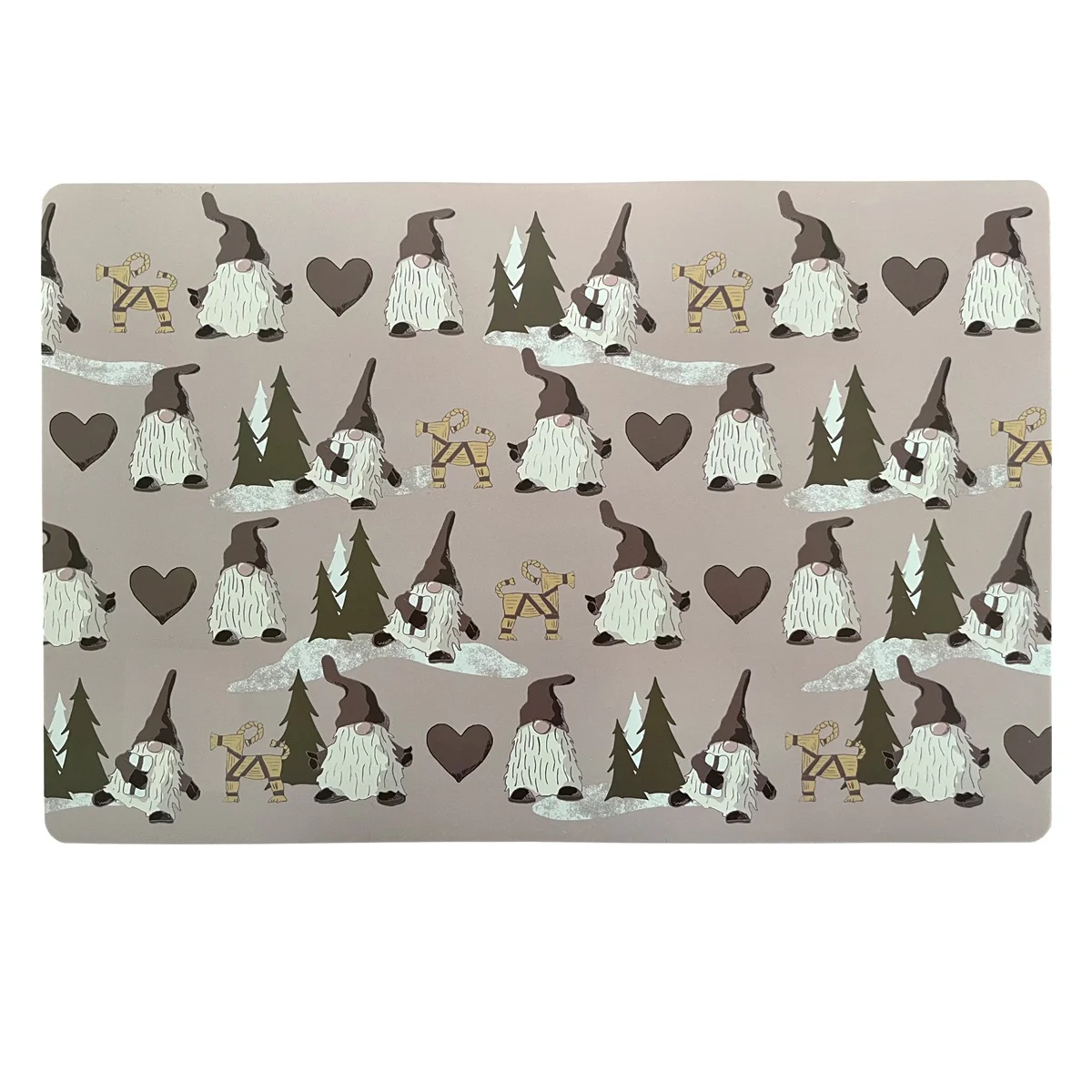 Plasttablett NOEL med tomtar, granar, hjärtan och halmjulbockar i grått på mullvadsfärgad botten