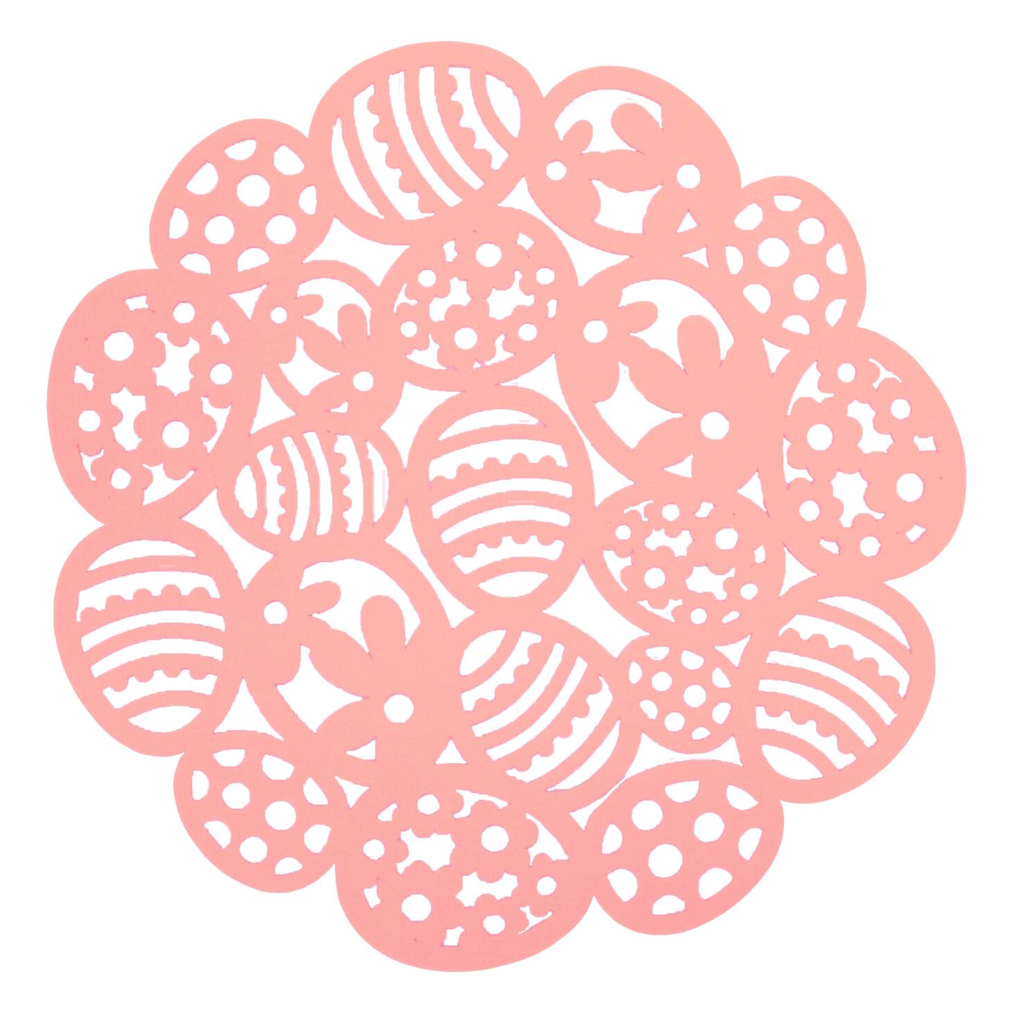 Diameter 38 cm. Bordstablett, tallriksunderlägg EGGS med rosa ägg i olika mönster utstansade i mjukt filtmaterial. Avtorkas med lätt fuktig trasa