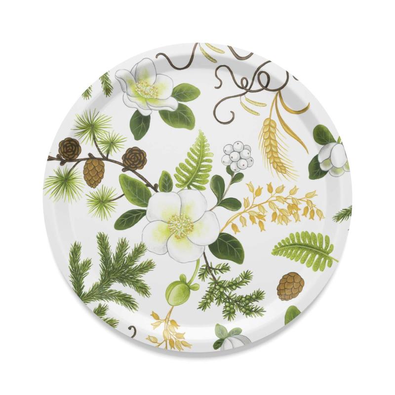 Stl. 31cm. Rund bricka Barr & Blom med vackra slingrande julrosor, kottar och grankvistar. Design: MiaLotta Arvidsson-Mars