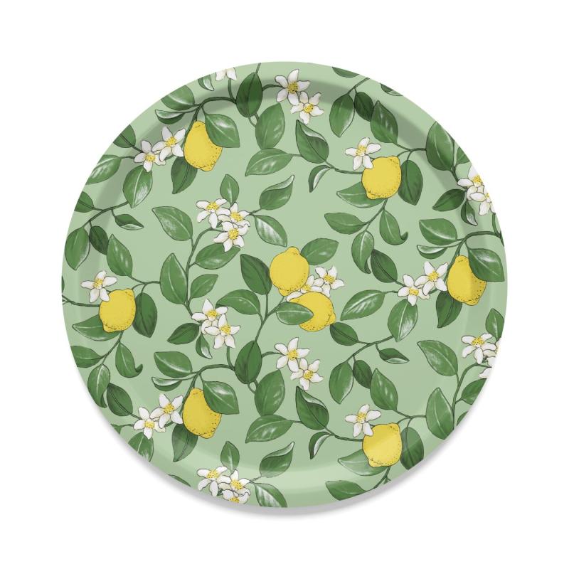 Rund bricka CITRONLYCKA med gula citroner på grön bottenfärg