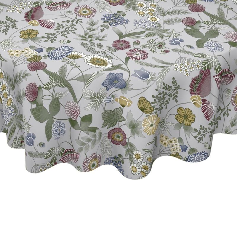 Rund Vaxduk HILDA med ängsblommor i rosa, blått och gult på grå botten