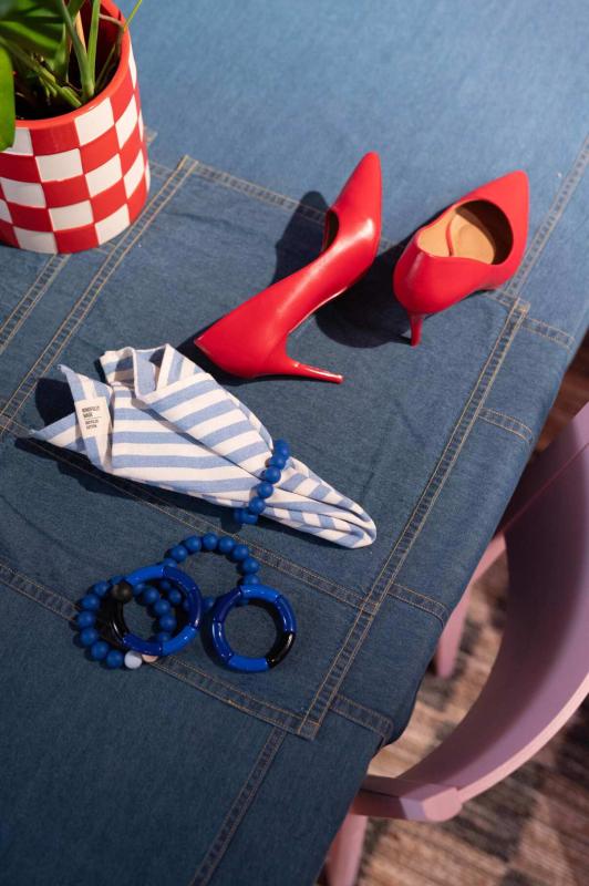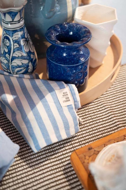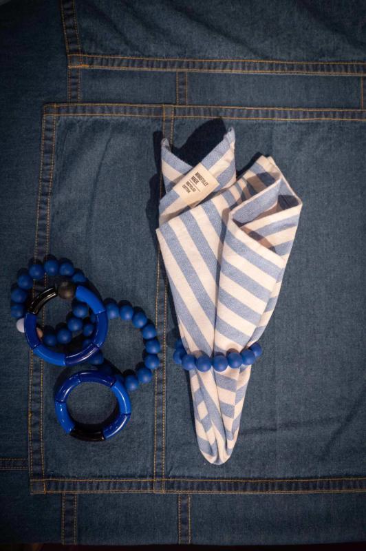 En servett i härliga färger, som är tillverkad av återvunnen bomull och återvunnen polyester, vilket gör den både miljövänlig och hållbar. Den klassiska randen ger servetten en tidlös charm och gör den till ett perfekt komplement till olika typer av dukningar och bordsdekorationer.