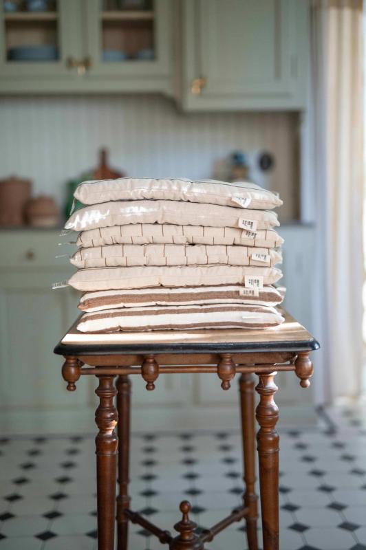 Sittdyna tillverkad av återvunnen bomull / polyester som både är miljövänlig och funktionell. Garnfärgad mönstervävd rand som ger den en klassisk stil.