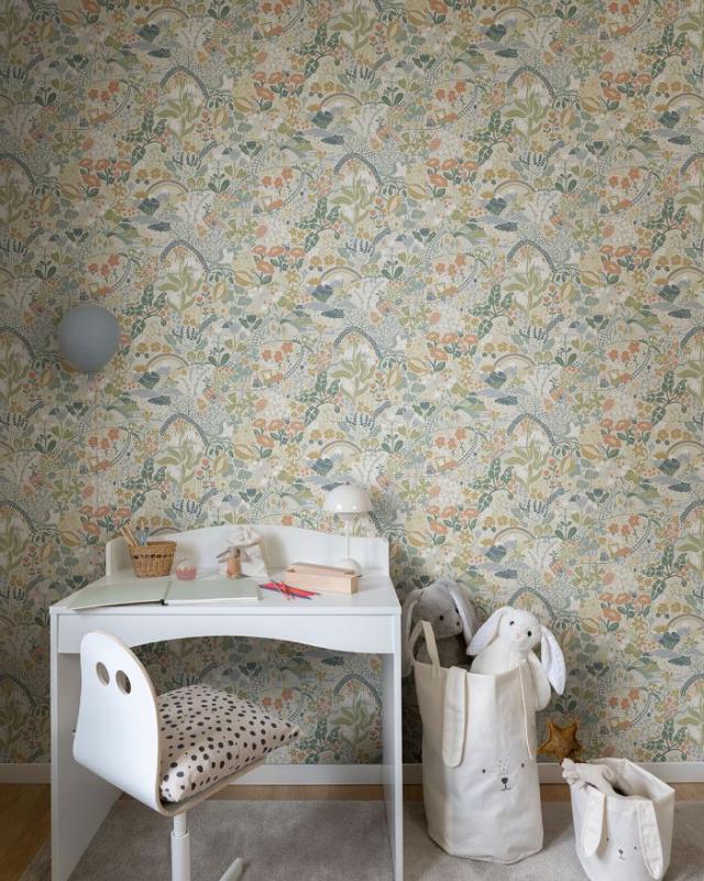 I barntapeten Tåget färdas vi över kullar och genom djupa dalar. På en beige botten gror främmande växter, åskan mullrar över havet och solen går upp över snöklädda berg. I nyanser av gråblått, olivgrönt, terakotta, petrolgrönt, vitt och senapsgul färdas det lilla tåget på sin resa genom skiftande landskap. Designad av Lina Schnaufer.