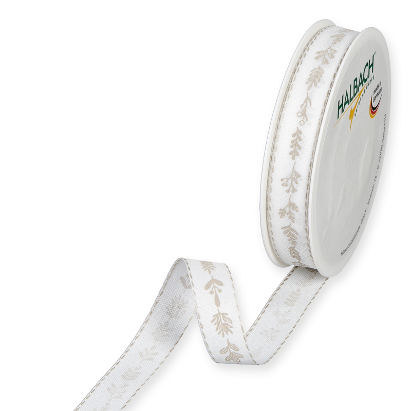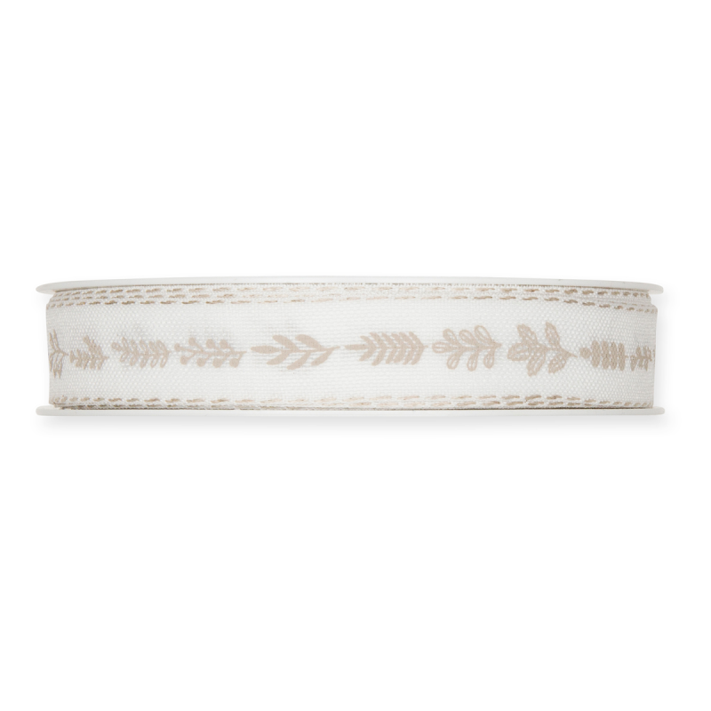 Bredd 15mm. Textilband KVISTAR är ett textilband med tryckta kvistar och en färgad tråd i kanten.. Band för pyssel, kransar och dekorationer.