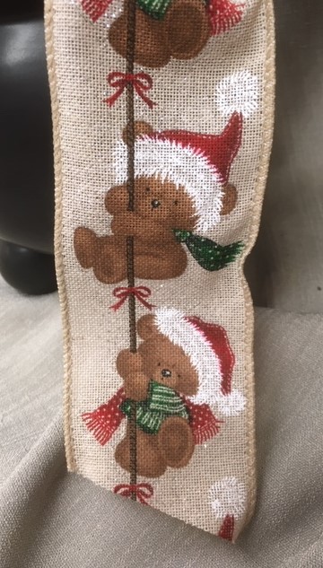 Bredd: 63 mm. Beige band med söta nallar med tomteluva. Bandet har ståltråd i kanten för att lätt kunna formas till fina rosetter.
