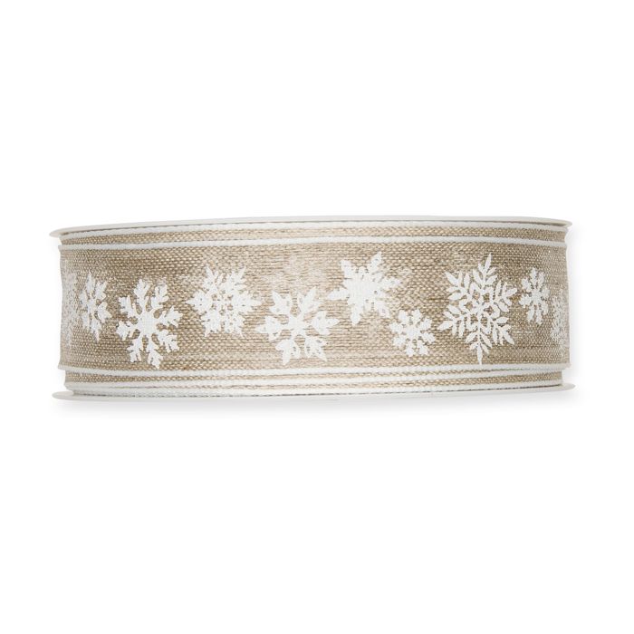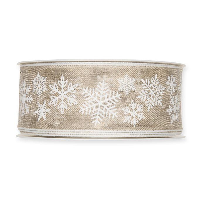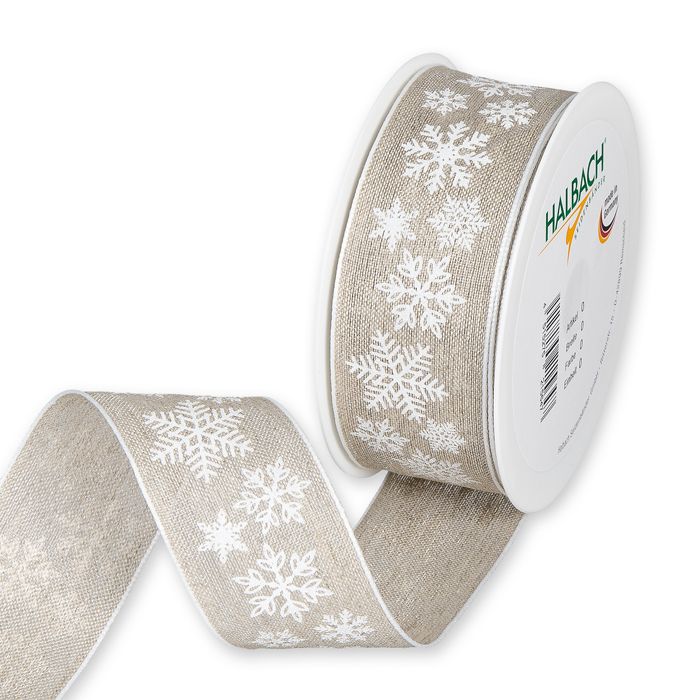 Textilband SNÖSTJÄRNA, tryckta vita snöflingor på linnefärgad botten, bredd 25 mm och 40 mm