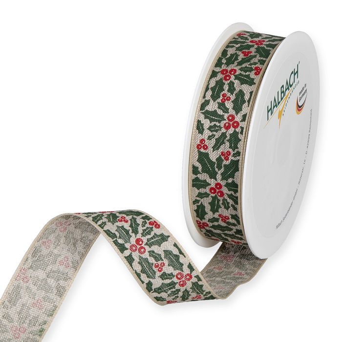 Textilband, tryckt järnek i rött och grönt på linnefärgad botten, ståltrådskant