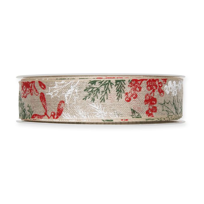 Textilband, tryckta grenar, bär och blad i rött grönt och vitt, linnefärgad botten, ståltrådskant