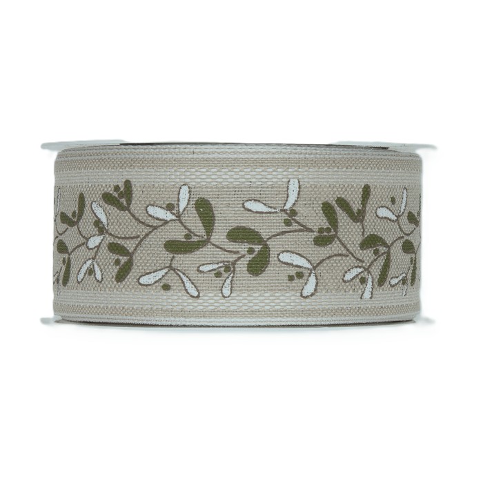 Textilband, vävt linnefärgat band med myrtenmönster i vitt och grönt och med vit dekorkant