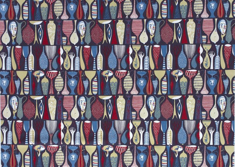 Tyg på metervara, mönster POTTERY av Stig Lindberg, blåsvart