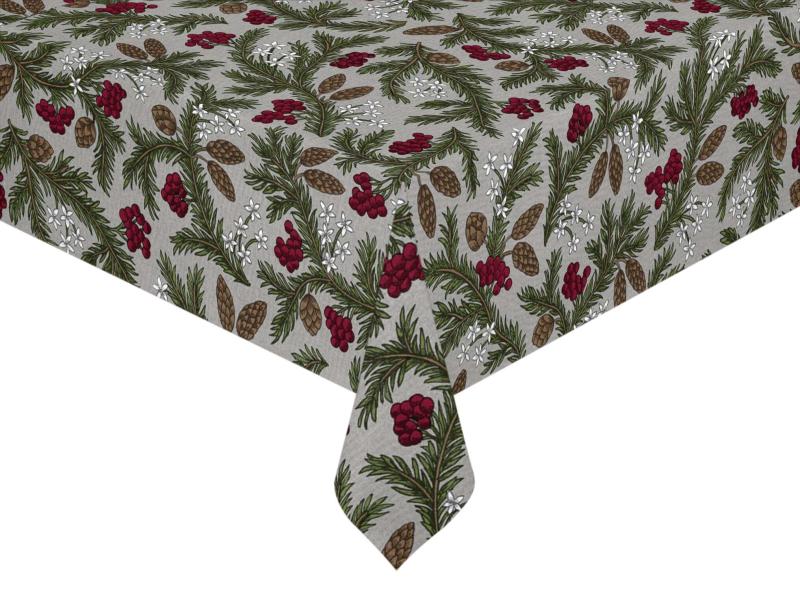 Vaxduk på metervara, KVIST, med kottar, bär och gröna kvistar, bredd 140cm, grå.